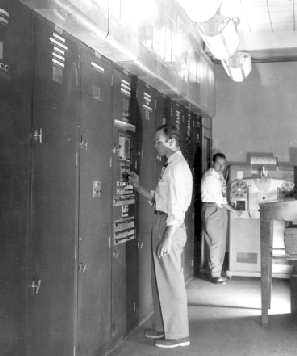 O primeiro computador comercial de grande escala foi o UNIVAC, UNIVersal Automatic Computer, americano, de 1951, que era programado ajustando-se cerca de 6.000 chaves e conectando-se cabos a um painel. A entrada e saída de informações era realizada por uma fita metálica de 1/2 polegada de largura e 400 m de comprimento. Ao todo, venderam-se 46 unidades do UNIVAC Modelo I, que eram normalmente acompanhados de um dispositivo impressor chamado UNIPRINTER, que, sozinho, consumia 14.000 W. Outro foi o IBM 701, de 1952, que utilizava fita plástica, mais rápida que a metálica do UNIVAC, e o IBM 704, com a capacidade fenomenal de armazenar 8.192 palavras de 36 bits, ambos da IBM. Na Inglaterra surgem o MADAM, Manchester Automatic Digital Machine, o SEC, Simple Electronic Computer, e o APEC, All-Purpose Electronic Computer.